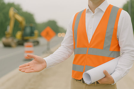 AI generated A professional civil engineer stands at the frame's edge gesturing toward an active road construction site. The infrastructure development scene showcases urban planning, engineering