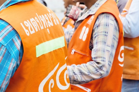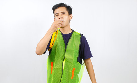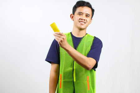 Portrait of young Asian man wearing safety vest and looking at wristwatch