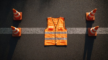 A bright orange safety vest placed on an asphalt surface, surrounded by traffic cones, emphasizing the importance of visibility and safety in work or construction zones.