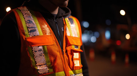A close-up image of a worker in a reflective safety vest at night, emphasizing visibility in low-light conditions. The blurred background features city lights.