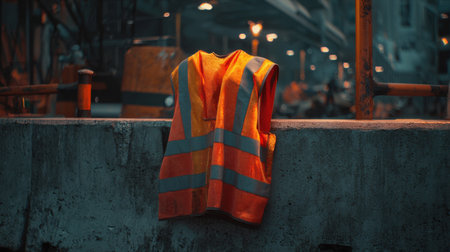 A bright orange safety vest hangs on a concrete barrier, showcasing its reflective stripes. The construction site in the background features warm lighting and industrial elements.