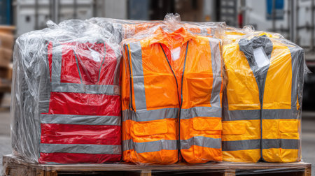 A collection of bright safety vests in red, orange, and yellow wrapped securely in plastic, perfect for enhancing visibility and safety in various work settings.