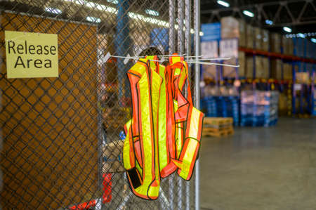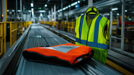 Brightly colored safety vests are displayed on a conveyor belt in a busy industrial warehouse, showcasing the importance of visibility and protection in the work environment.