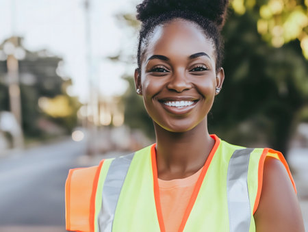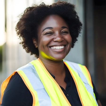Portrait of a young woman in a yellow hard hat and orange safety vest raising her fist confidently, symbolizing strength, motivation, and determination in a construction-related role.