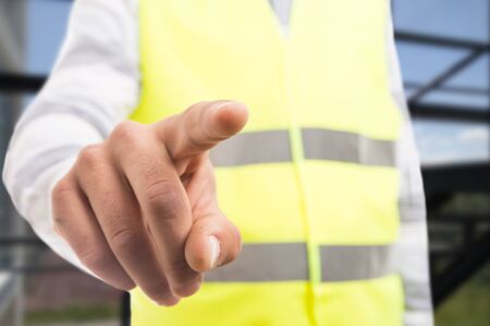 Engineer touching invisible transparent screen display with index finger outdoors on construction site