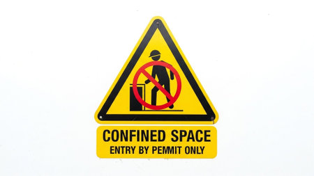 Close-up of a safety poster on a factory wall, displaying guidelines for machine operation, with factory tools and equipment in the background and space for copy.