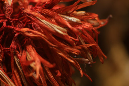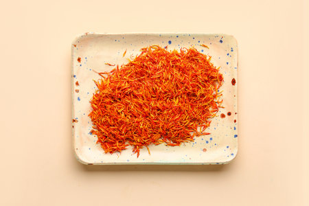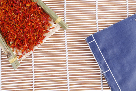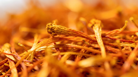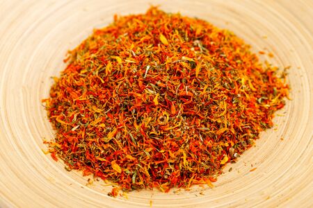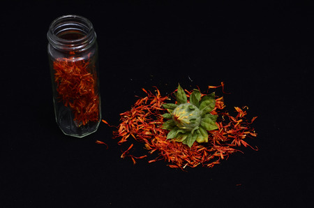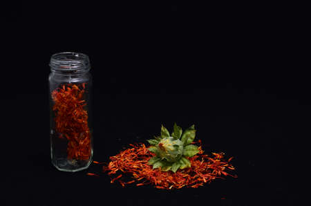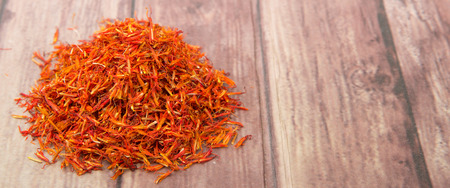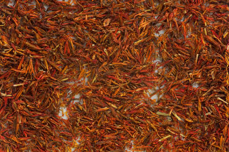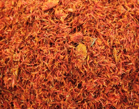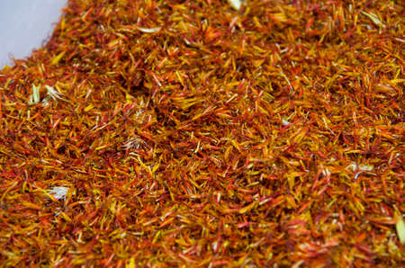 Saffron seasoning background. Organic Saffron or alternative to saffron - Safflower spice texture closeup.