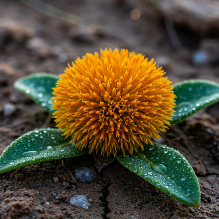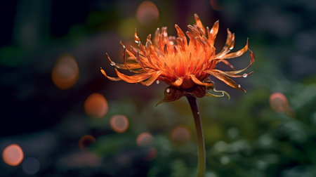 Yellow flower with dew drops on the ground. Shallow depth of field