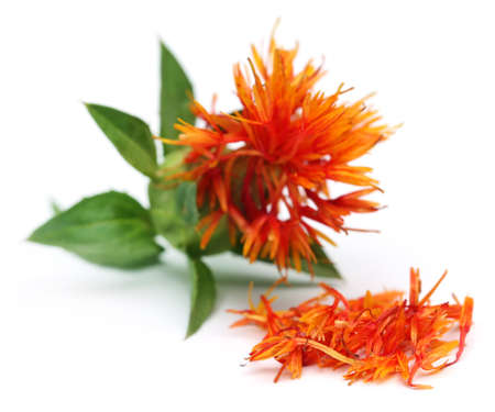 Dried safflower for herbal tea on white background, dry safflower petals, Saffron substitute