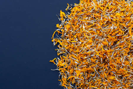 Dried marigold flower petals on white background. Flower herbal tea concept.