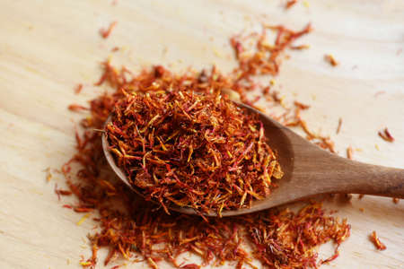 Dried safflower for herbal tea on wood background, dry safflower petals in wooden spoon, Saffron substitute
