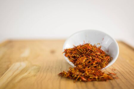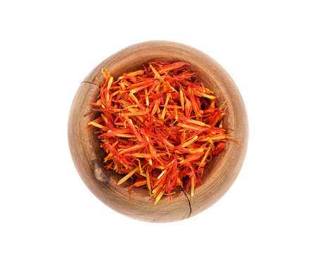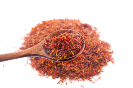 Safflower petals (Saffron substitute) in wooden spoon isolated on white background