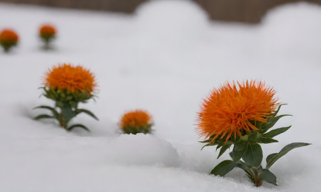 Orange and yellow thistle flowers in the snow on a cold winter day