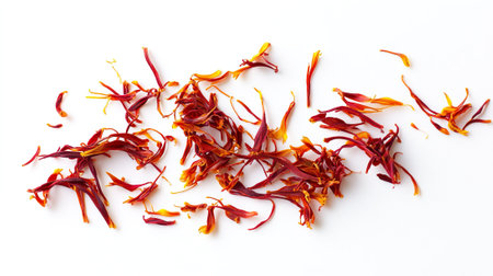 photo of saffron threads delicately scattered, soft natural lighting, macro shot, isolated on white background, photography --ar 16:9 --style raw --v 6.1 Job ID: 37c05533-cc87-4b2f-8b3f-59426369f021