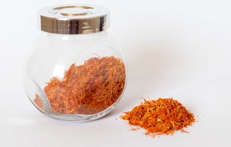 Close up shot on the white background of the dried saffron leaves spice in a small glass jar container