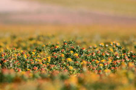 Blooming yellow red flower field on riverbank at dusk, colorful yellow flower with red center are in bloom near the Mekong River in summer. Close. Selective focus.