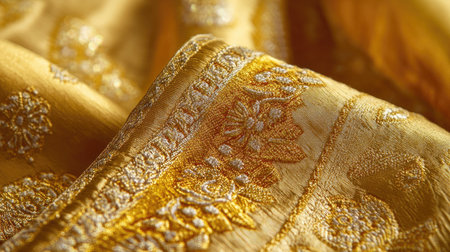 Close-up of luxurious golden fabric showcasing intricate embroidery and a rich texture, perfect for fashion, decor, or artistic projects.
