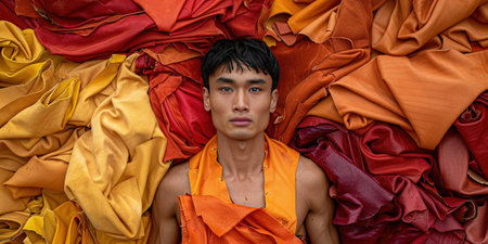 A close-up portrait of a man wearing traditional attire featuring vibrant, intricate patterns. The image highlights cultural richness and artistry in design.