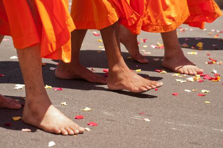 The monks are walking on yellow marigold petals. / The faithful Buddhists are placed for the monks.