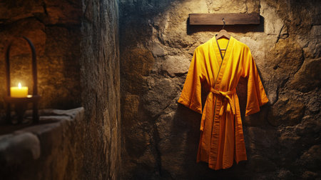 A vibrant orange bathrobe drapes elegantly on a rustic stone wall, paired with soft candlelight to evoke a soothing and tranquil spa experience.