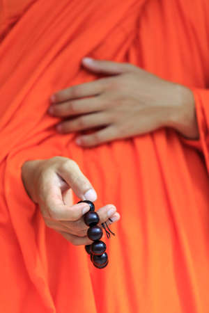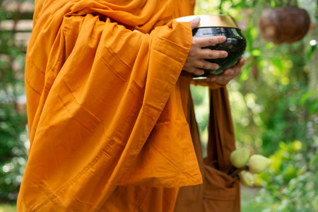 hand of monk dressing orange robe, holding bowl during reception of alms, around buddhist temple