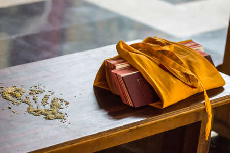 Coorg, India - October 29, 2013: Inside Padmasambhava Vihara of Namdroling Buddhist Monastery. Set of prayer books of monk or nun, captured in ochre fabric, displayed on bench with rice kernels.