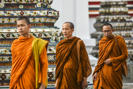 BANGKOK, THAILAND - February 02 2017: A group of monks, lined up outside the Royal Palace, waiting to go in. To honor, the passing of Majesty King Bhumibol in Bangkok.