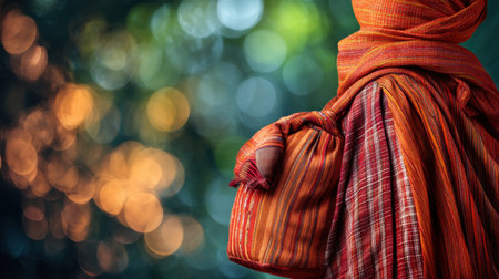 A striking image featuring a traditional garment in rich colors, paired with a soft bokeh background that highlights its intricate texture and cultural significance.