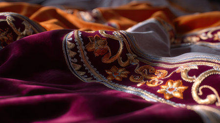 This captivating image showcases an elegant silk fabric adorned with intricate embroidery, featuring rich colors and textures ideal for fashion or textile design.