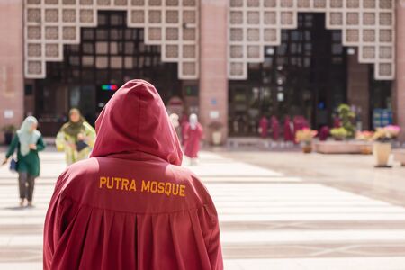Putra Mosque: dress code for female visitors to enter the mosque. They will be ordered to put on a red coat with a hood. It is one of the most visited landmarks in Putrajaya, Malaysia.