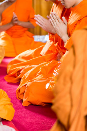 Close-up to Newly ordained Buddhist monk pray with priest procession. Newly ordained Buddhist monks have a ritual in the temple procession.
