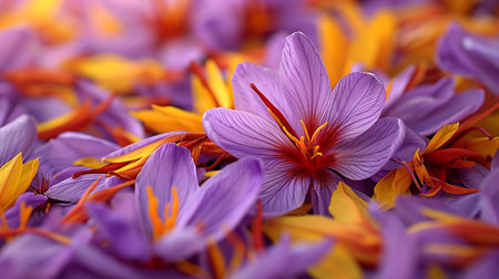 Explore the vibrant beauty of saffron flowers alongside rich spice powder on a rustic wooden surface, perfect for culinary art and natural aesthetics.