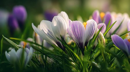Close-up of beautiful crocus flowers with purple and white petals blooming among green blades of grass, bathed in warm spring sunlight, creating a vibrant scene.