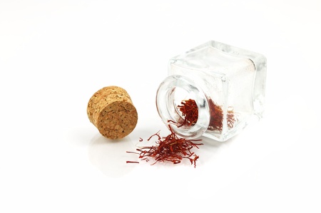 Close up shot on the white background of the dried saffron leaves spice in a small glass jar container