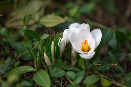 White spring crocuses in the early morning outdoors. The first spring flowers against the backdrop of periwinkle foliage.