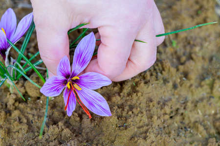 The girl's hand picks a purple saffron flower, Crocus sativus, growing in the field, red saffron threads are used as a culinary spice and dye.