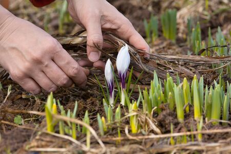 hands removing old leaves and grass from the flowerbed with crocuses in the garden