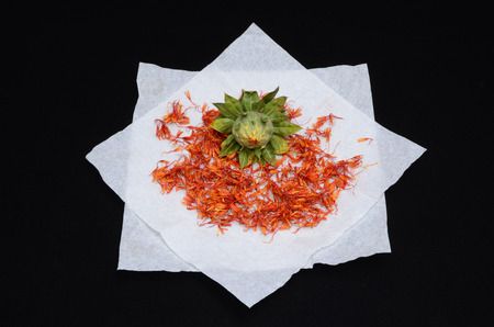 Dried safflower for herbal tea on white background, dry safflower petals, Saffron substitute