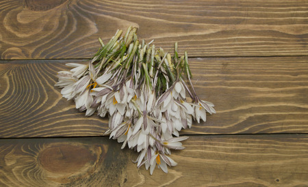 Wooden background with purple flowers saffron and stamens.