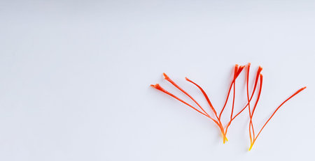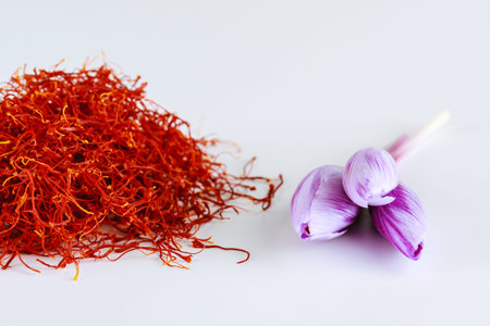 Saffron stamens and crocus buds on a white background. Dry saffron stamens. Place for text.
