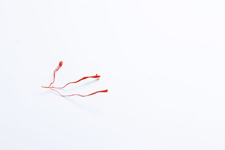 Close-up macro shot of isolated saffron stigmas on white background.