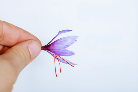 The most expensive spice in the world is held by a girl's hand. Saffron crocus plucked from the plantation.