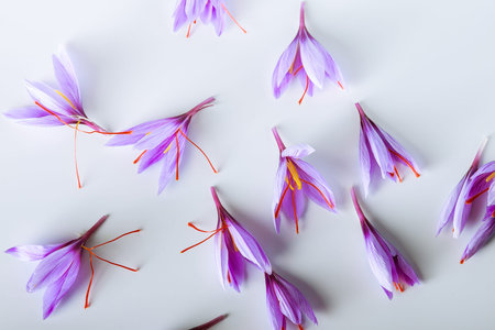 Crocus flowers and saffron stamens scattered on a white background. Macro photo. Place for text.