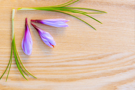 Fresh saffron stem and flower on a wooden surface. Copy space. Place for your text.