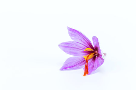 Single saffron flower on a white background. Copyspace.
