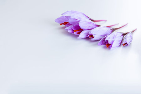 Saffron flowers on a white background. Saffron crocuses have three red saffron stamens.
