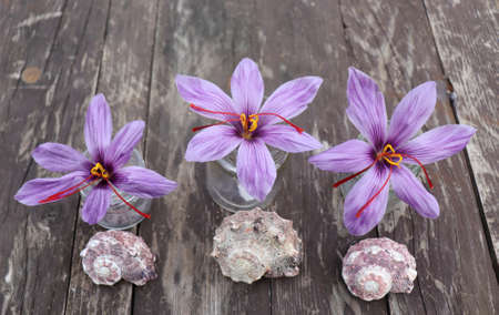 Crocus sativus, commonly known as saffron crocus on a wooden background with seashells. It is among the worlds most costly spices by weight. In October, the saffron is usually perfect for harvesting.