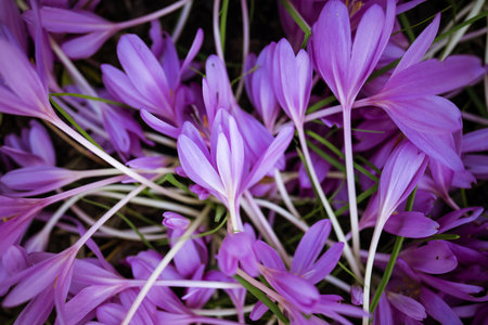 Saffron flowers in the field. Crocus sativus, commonly known as saffron crocus, delicate violet petals plant on ground, closeup above view