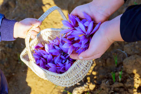 Flowering saffron plant. Harvesting crocus flowers for the most expensive spice. Purple crocus flowers.