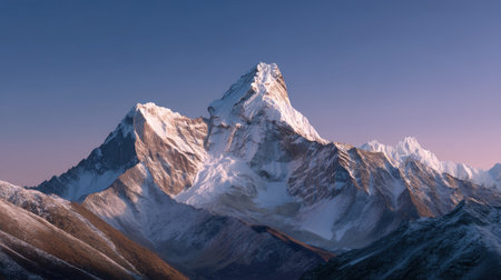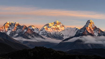 Experience the breathtaking beauty of majestic snow-capped mountain peaks illuminated by soft morning light in the Himalayas, showcasing nature's grandeur.